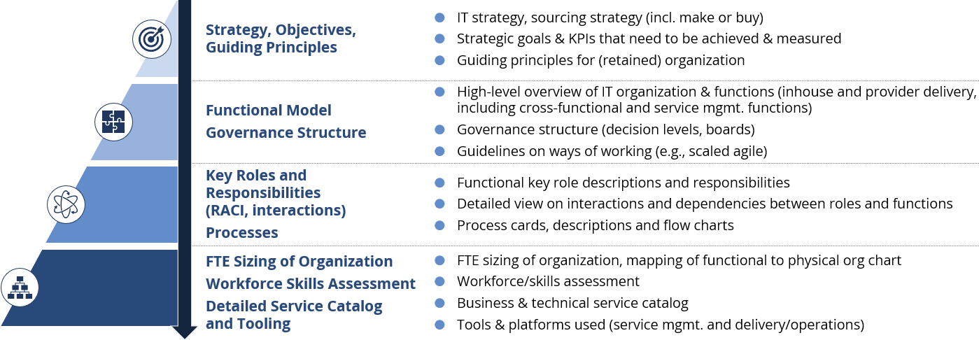 Based on decades of project experience, we have developed a functional model blueprint for IT organizations. Because every organization is different, the blueprint is always adapted to specific needs and targets.